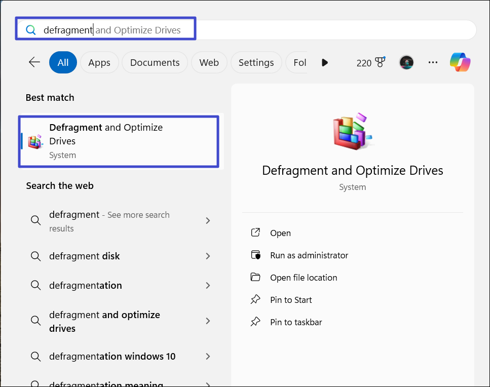1. Kliknij przycisk Start, wpisz „zdefragmentować” na pasku wyszukiwania i wybierz „Defragmentuj i optymalizuj dyski” z wyników.