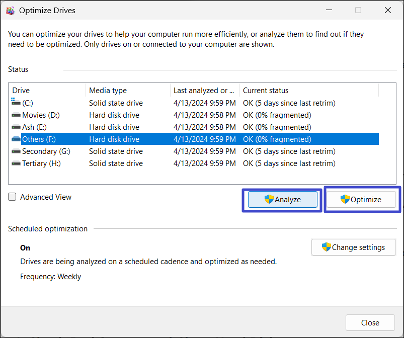 3. Najpierw kliknij „Analizować”, aby przeanalizować dysk pod kątem fragmentacji. Następnie kliknij „Być optymistą”, aby zdefragmentować dysk.