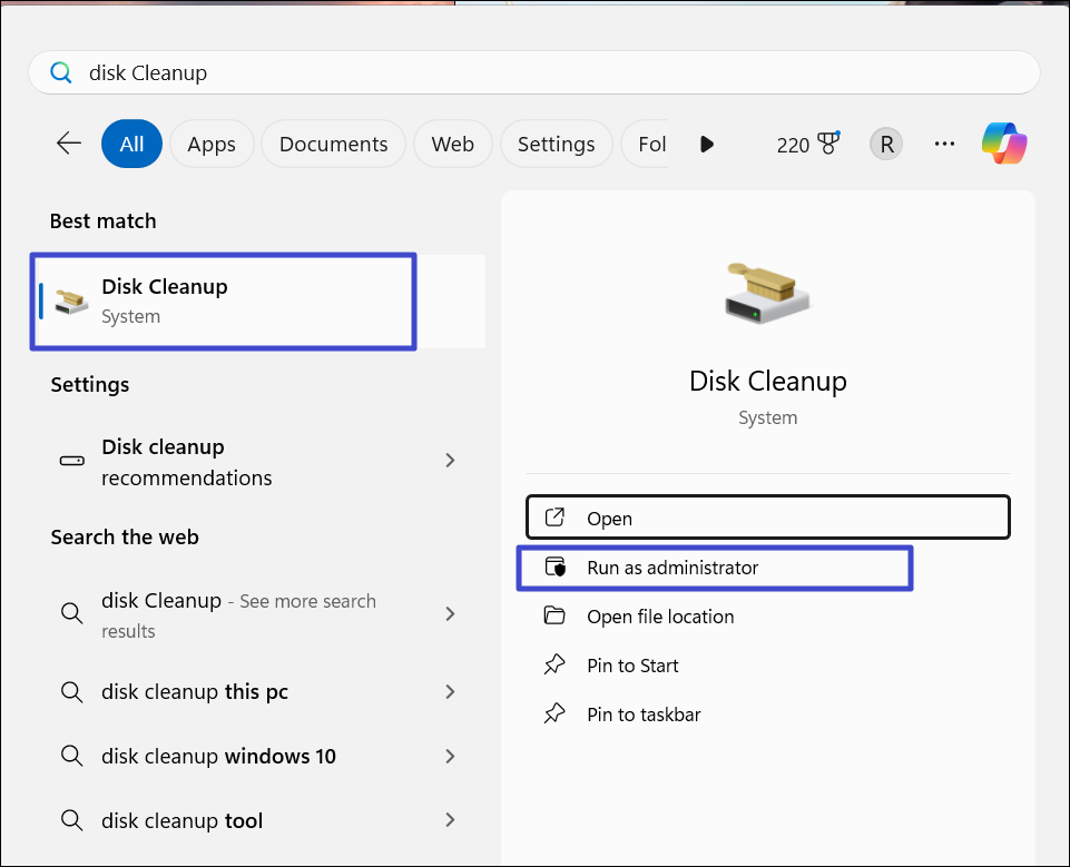 1. Wpisz „Oczyszczanie dysku” w wyszukiwarce Windows i wybierz najwyższy wynik.
