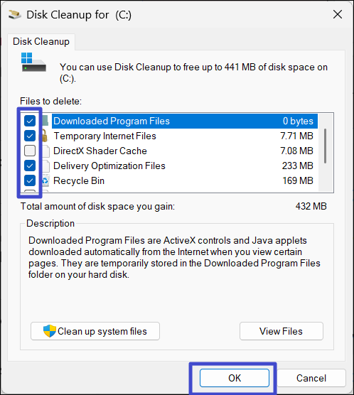 3. Następnie wybierz pliki, które chcesz usunąćTymczasowe pliki internetowe,Kosz,Pliki tymczasowe,itp. i kliknij „OK“.