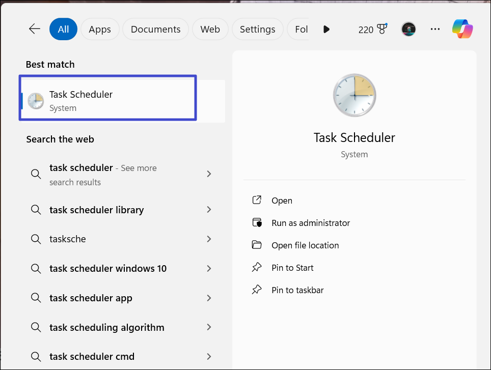 1. Naciśnij Windows + S, wpisz „Harmonogram zadań„ i wybierz „Harmonogram zadań" pożytek.