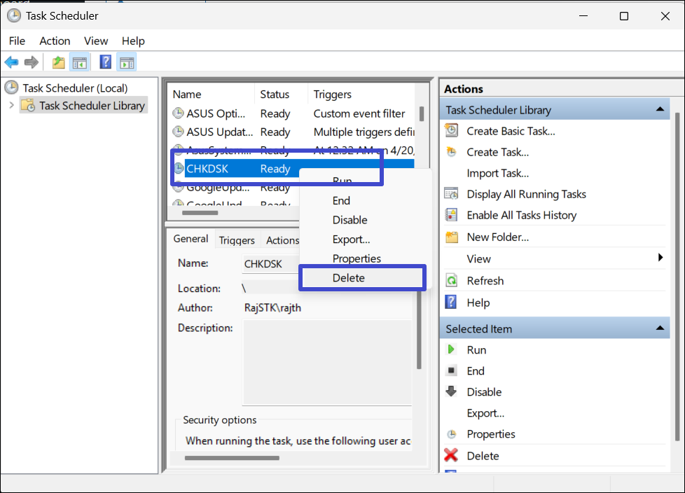 W niektórych przypadkach, jeśli CHKDSK jest ustawiony jako zaplanowane zadanie, może utknąć podczas uruchamiania systemu Windows. Aby temu zapobiec, musisz usunąć CHDSK z listy zaplanowanych zadań.
