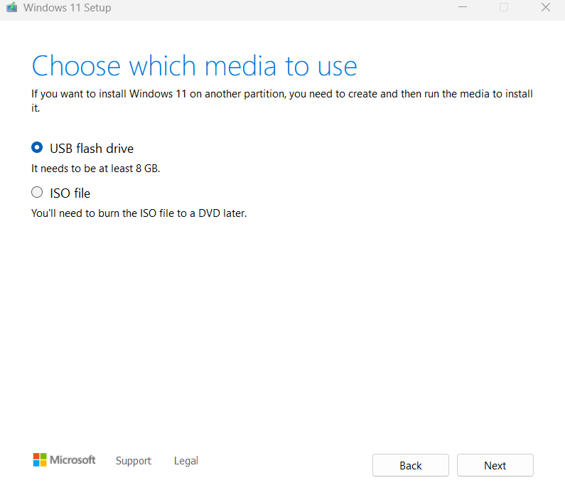 3. Wybierz nośnik – dysk flash USB lub plik ISO > kliknij Dalej.