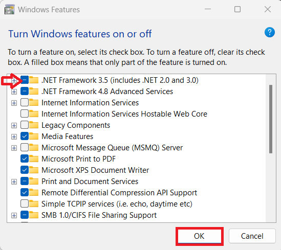 3. Odznacz opcję .NET Framework 3.5 (w tym .NET 2.0 i 3.0) i kliknij OK.