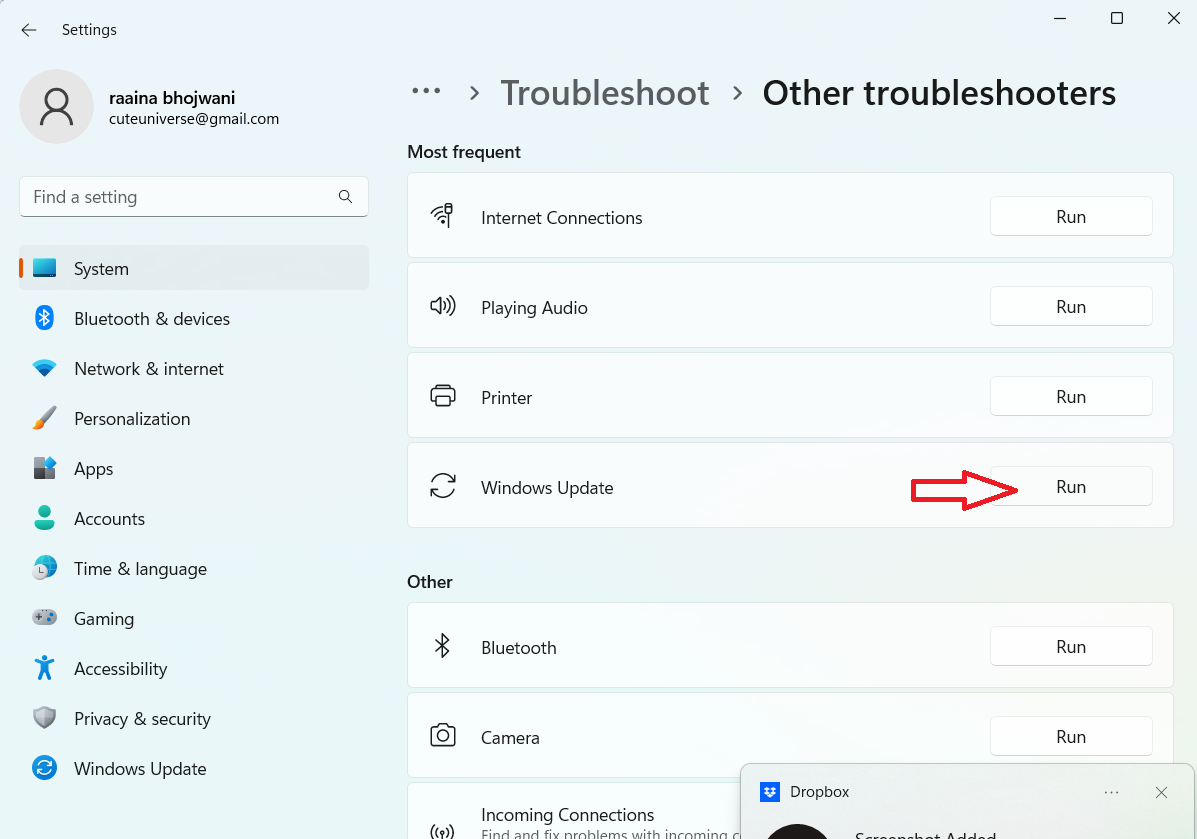 4. Kliknij przycisk Uruchom obok Windows Update.
