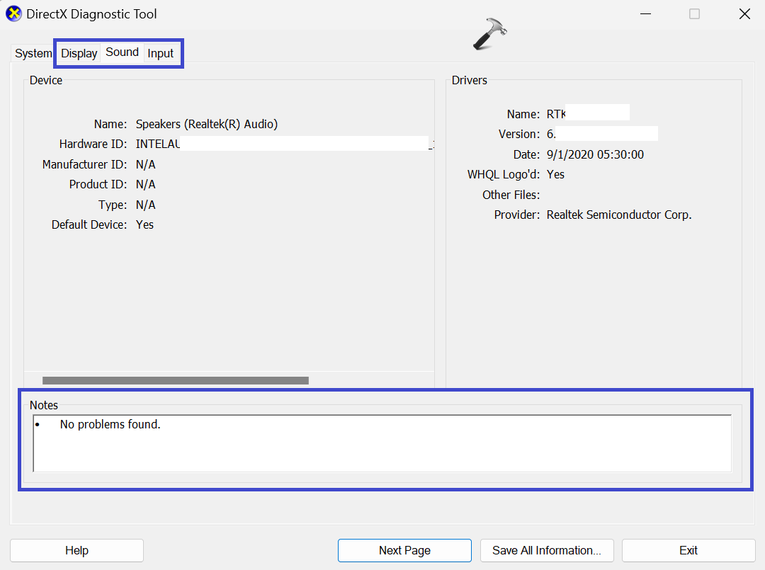 4. Teraz przejdź doWyświetlacz,Dźwięk, i jawejściekarty jedna po drugiej, aby sprawdzić, czy nie ma problemu wykrytego przez narzędzie diagnostyczne DirectX.