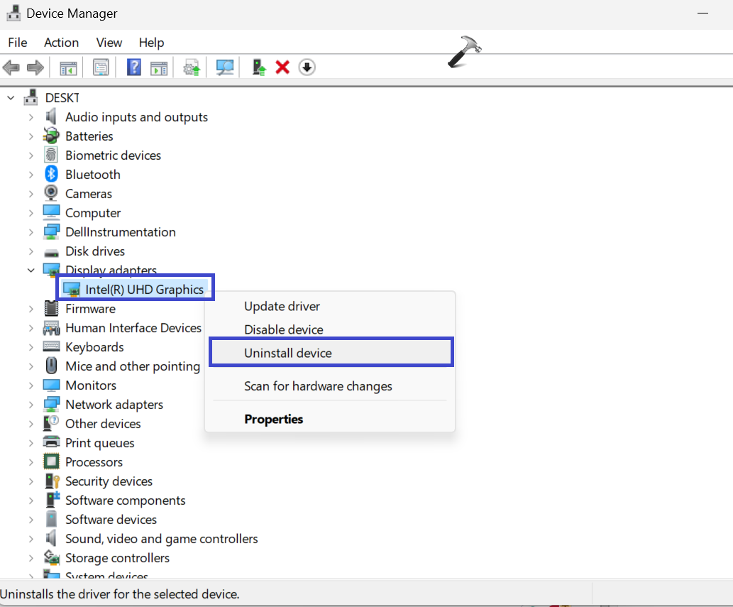 3. Teraz kliknij prawym przyciskiem myszy sterownik graficzny i kliknij „Odinstaluj urządzenie“.
