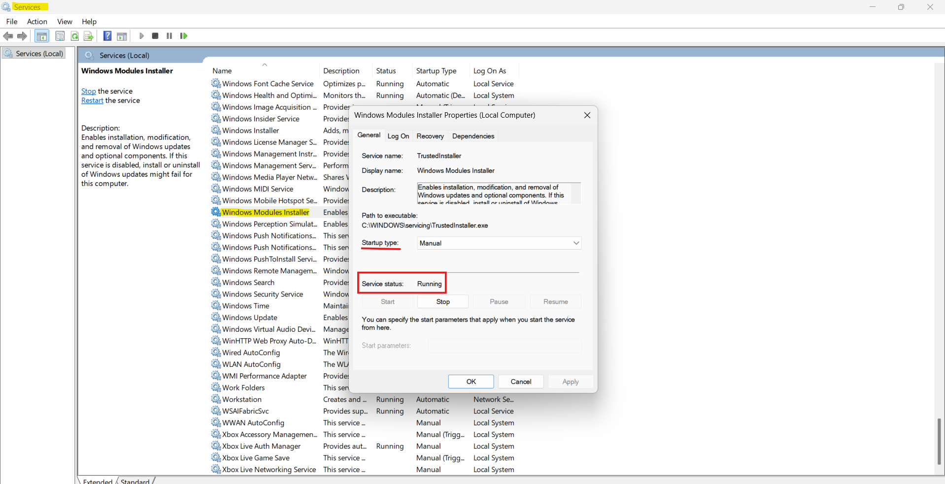 2. Znajdź Instalatora modułów systemu Windows i otwórz jego właściwości.