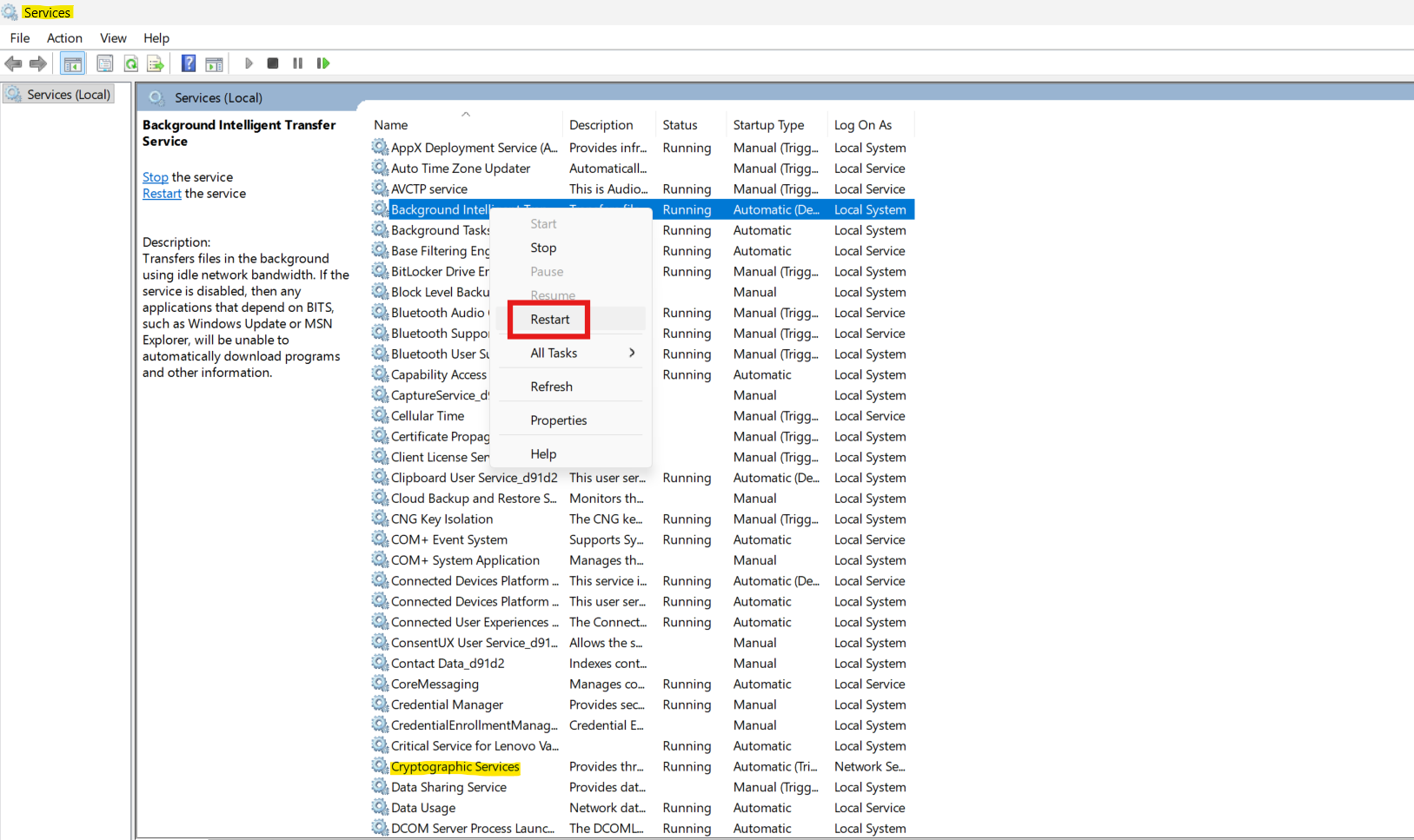 Poprawka 3: Uruchom ponownie ważne usługi aktualizacji, aby naprawić kod błędu 0x80070032 w systemie Windows 11/10