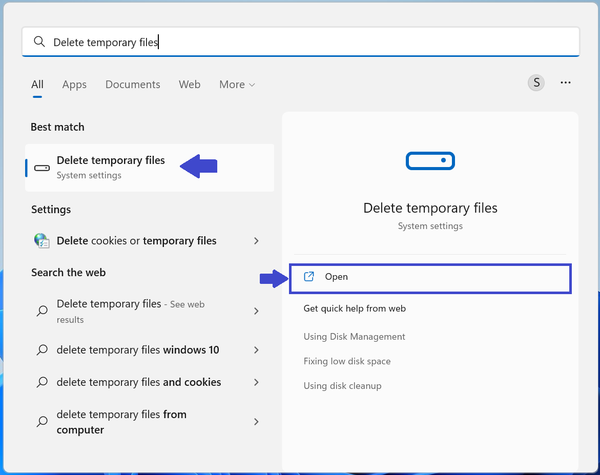 1. Wpisz „Usuń pliki tymczasowe” w polu wyszukiwania i kliknij „Otwórz”.