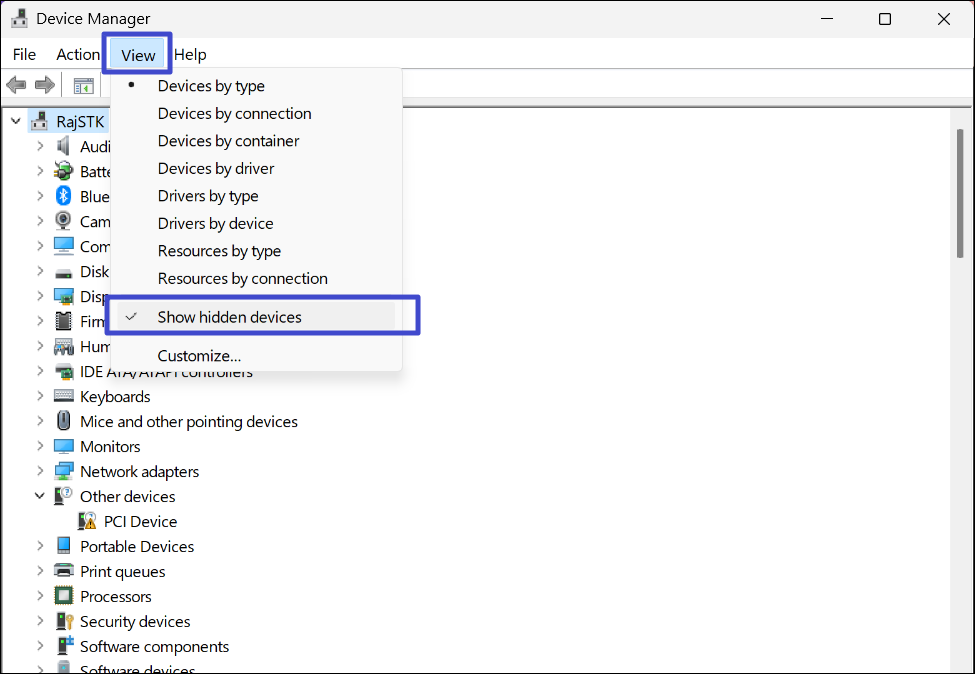 2. Kliknij „Pogląd"menu i wybierz „Pokaż ukryte urządzenia„.