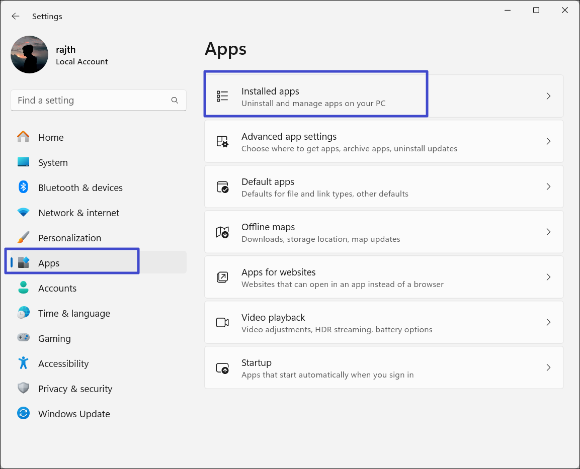 2. Przejdź do „Aplikacje”sekcję i kliknij „Zainstalowane aplikacje”po prawej stronie.