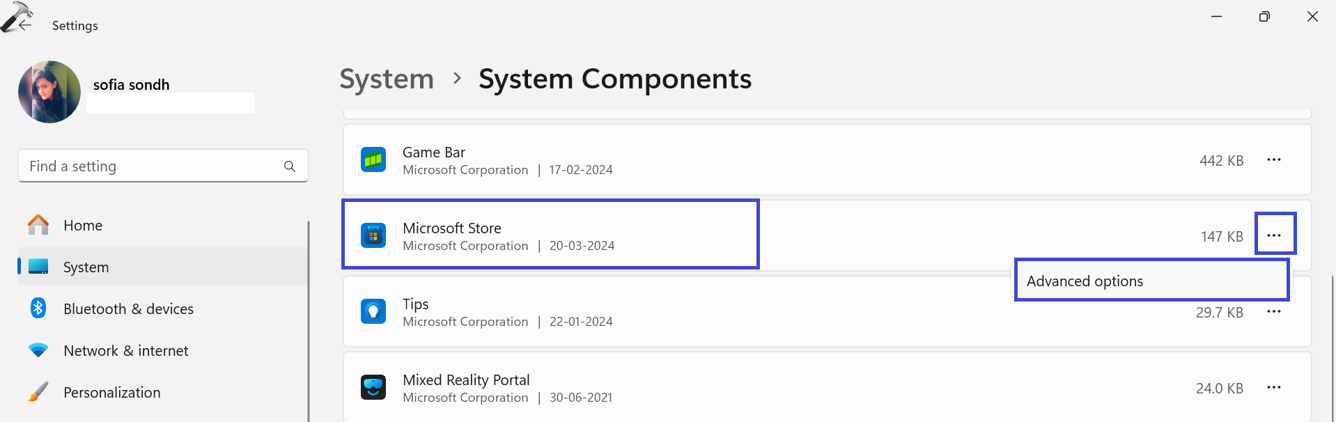 3. Kliknij elipsę (…) obok „Sklep Microsoftu” i wybierz „Opcja zaawansowanaopcja.