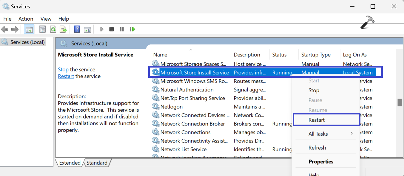2. Kliknij prawym przyciskiem myszy „Instalacja sklepu Microsoft praca” i wybierz „Uruchom ponownie”, aby ponownie uruchomić usługę.