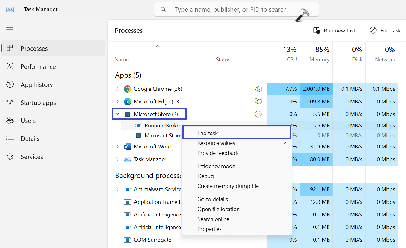Zidentyfikuj wszelkie procesy związane ze sklepem Microsoft Store (np. Microsoft.WindowsStore.exe). Kliknij na to i kliknij „Zakończ zadanie“.