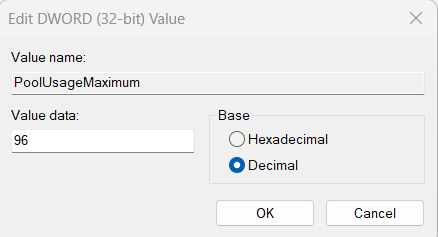 Poprawka 2: Zwiększ rozmiar kluczy PagedPoolSize i PoolUsageMaximum, aby naprawić. Istnieją niewystarczające zasoby systemowe, aby wykonać żądaną usługę