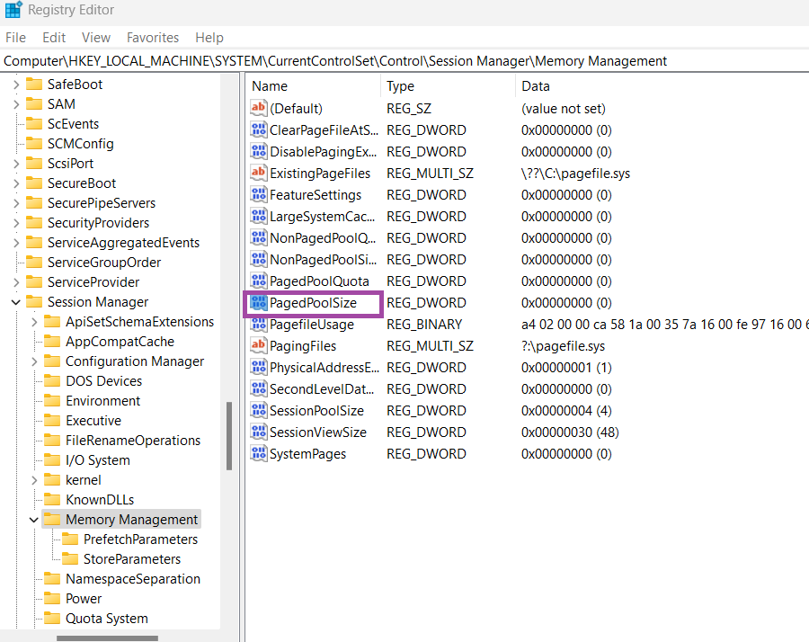 HKEY_LOCAL_MACHINESYSTEMCurrentControlSetControlSession ManagerMemory Management