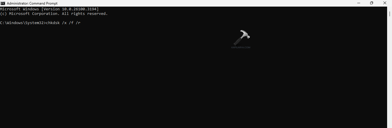 Krok 2-Teraz skopiuj i wklej poniższy monit, aby uruchomić polecenie CHKDSK i naciśnij Enter.