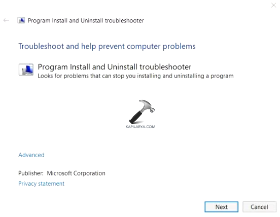 Krok 1-Najpierw pobierz narzędzie do rozwiązywania problemów z instalacją i dezinstalacją programu z oficjalnej witryny firmy Microsoft (https://support.microsoft.com/en-us/topic/fix-problems-that-block-programs-from-being-installed-or-removed-cca7d1b6-65a9-3d98-426b-e9f927e1eb4d).