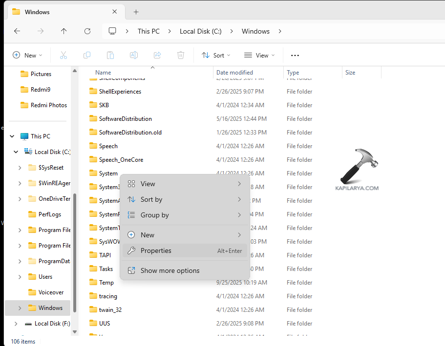 Krok 3-Następnie kliknij prawym przyciskiem myszy folder Temp i naciśnij Właściwości.