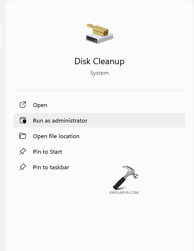 Krok 1-Najpierw wpisz oczyszczanie dysku w polu wyszukiwania i uruchom go jako administrator.