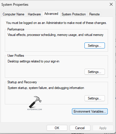 Krok 2-Następnie odwiedź kartę Zaawansowane. Tutaj naciśnij opcję Zmienne środowiskowe na dole.