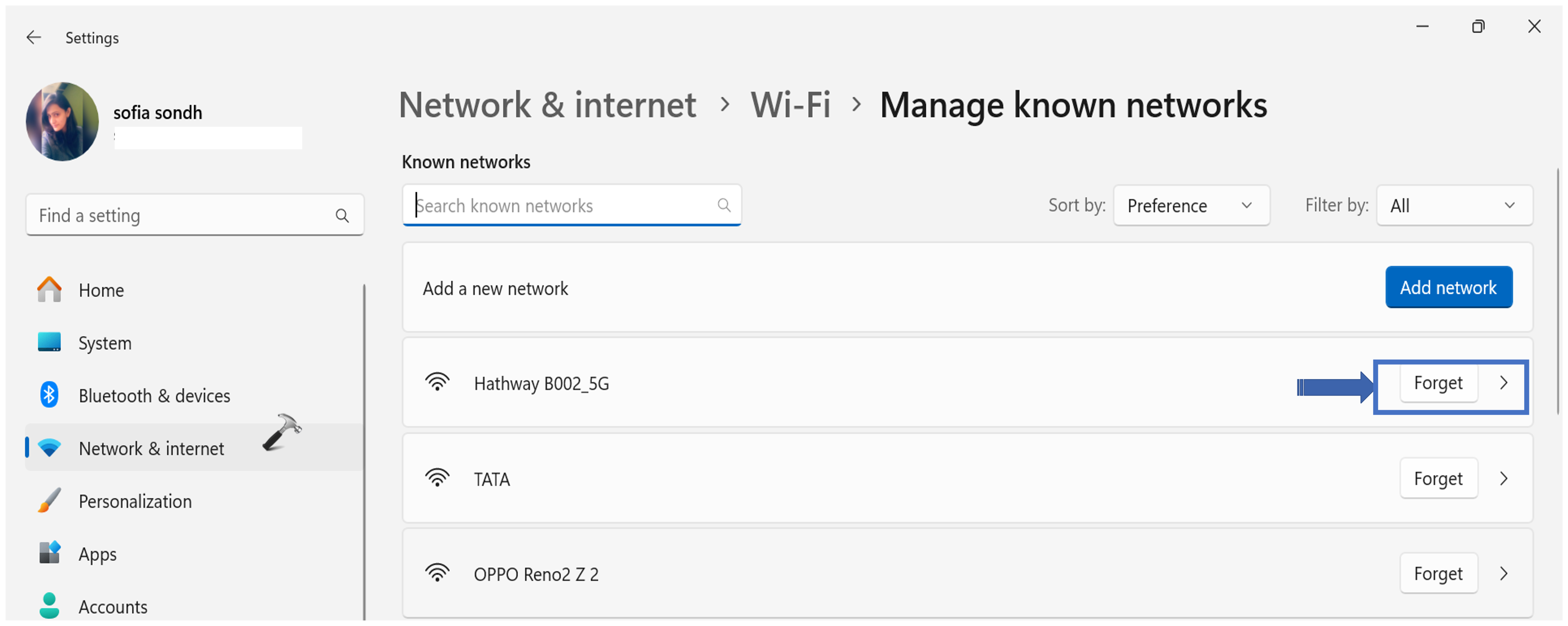 4. Kliknij „Zapominać” obok Twojej sieci.