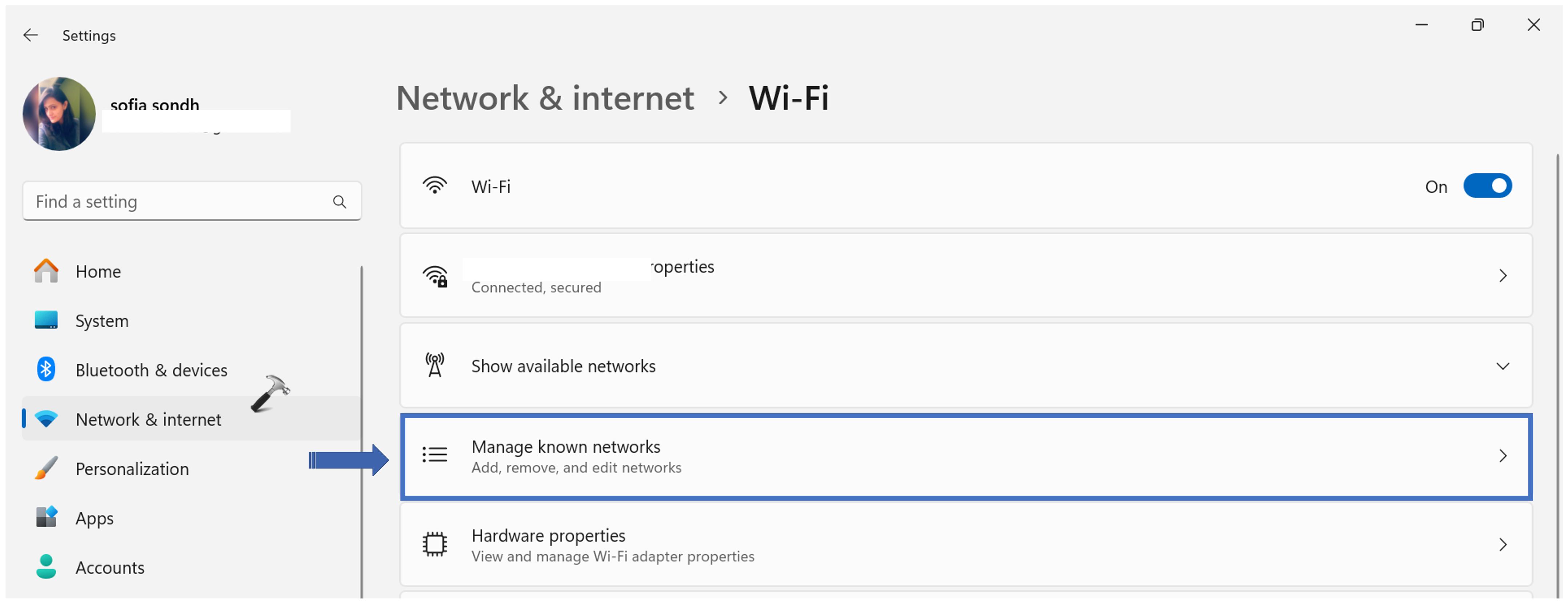 3. Tutaj wybierz „Zarządzaj znanymi sieciami“.