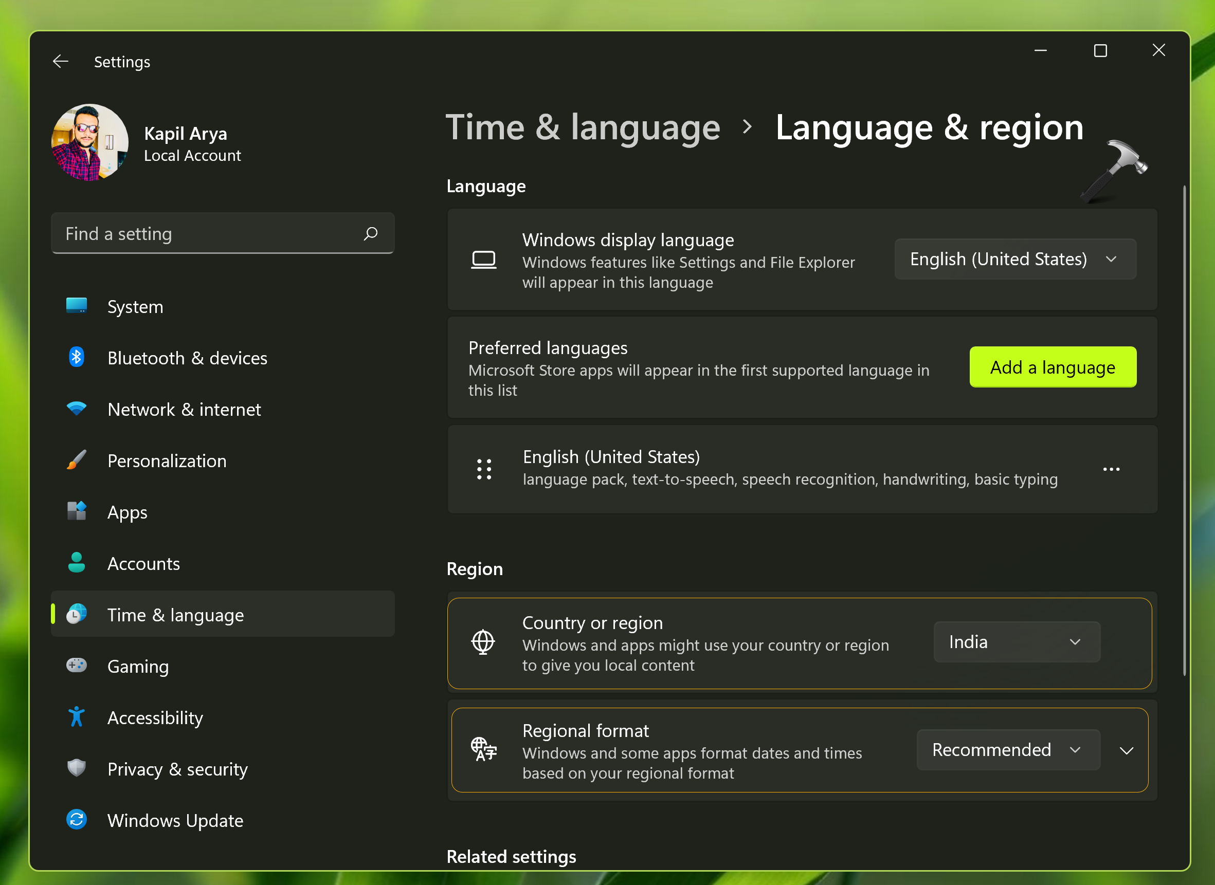 - W oknie Język i region sprawdź ustawienia regionu i formatu regionalnego i upewnij się, że są prawidłowe.