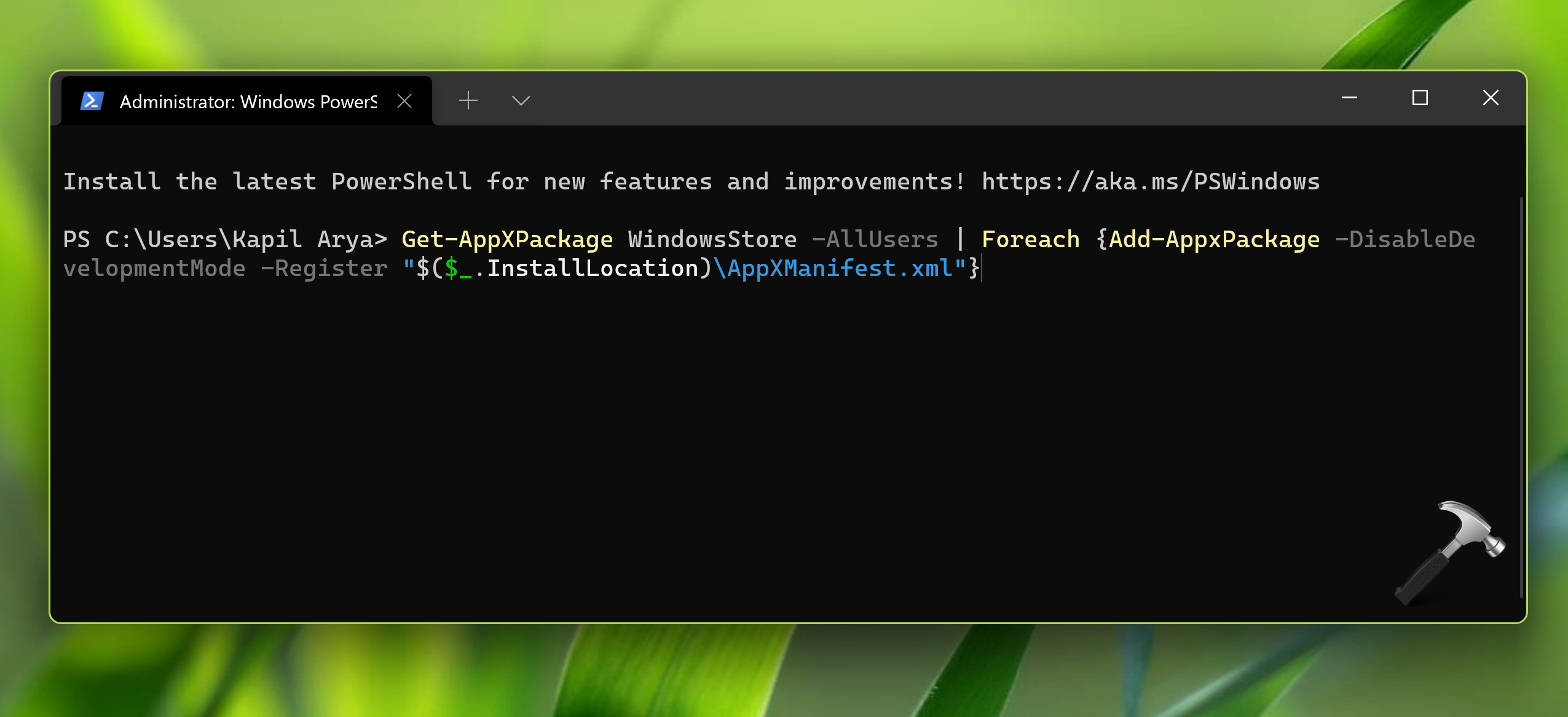 Ponieważ aplikacja Microsoft Store jest aplikacją wbudowaną, nie można jej odinstalować ani zainstalować ponownie. Zamiast tego możesz go ponownie zarejestrować za pomocą Windows PowerShell. Podczas ponownej rejestracji upewnij się, że sklep Microsoft Store nie działa nawet w tle.