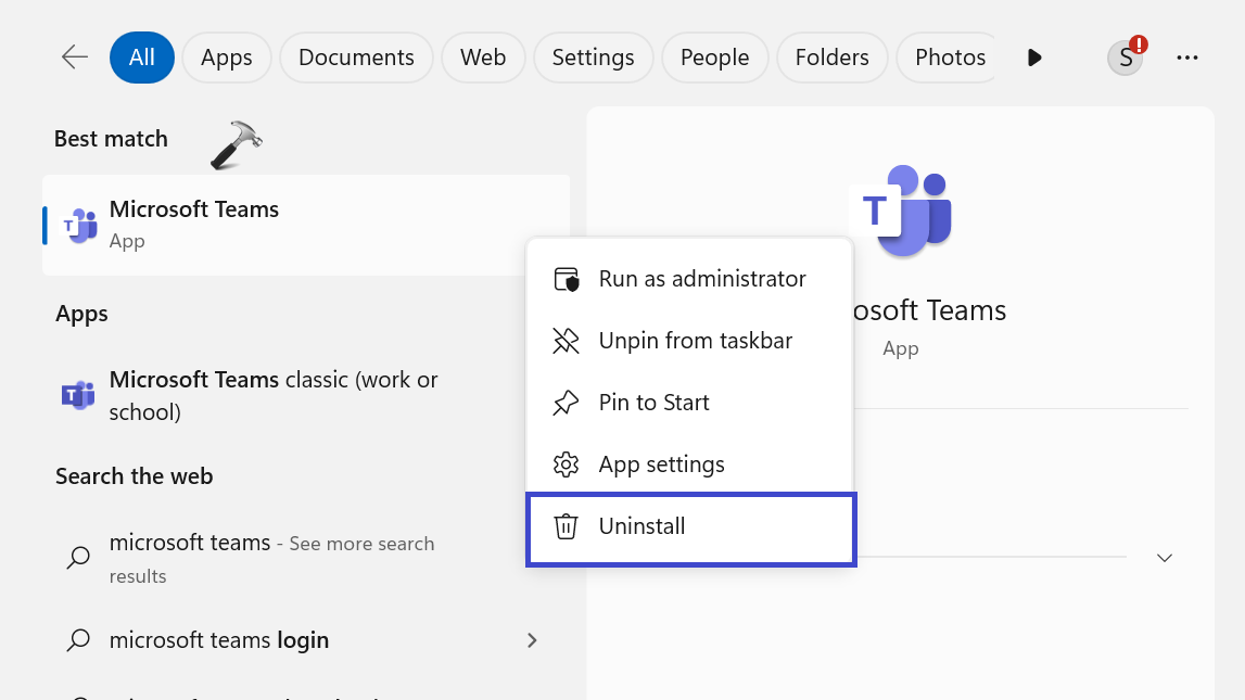2. Kliknij prawym przyciskiem myszy Microsoft Teams i wybierz „Odinstaluj„.