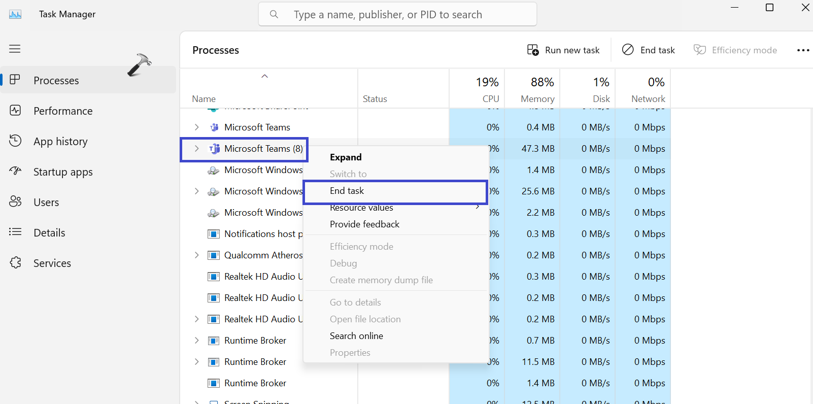 2. Kliknij prawym przyciskiem myszy Microsoft Teams i wybierz „Zakończ zadanie„.