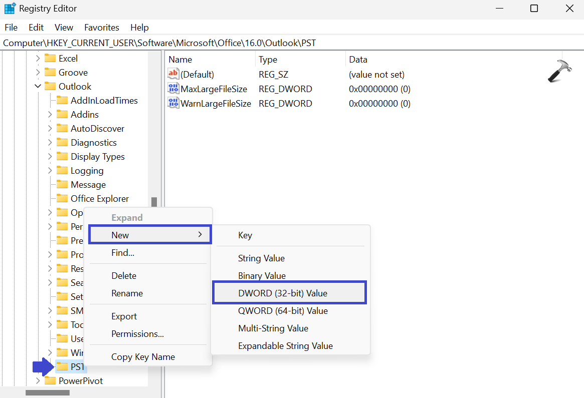 Aby utworzyć klucz, kliknij prawym przyciskiem myszy „PST” i wybierz Nowy => Wartość DWORD (32-bitowa). Wpisz „MaxLargeFileSize” i kliknij OK.