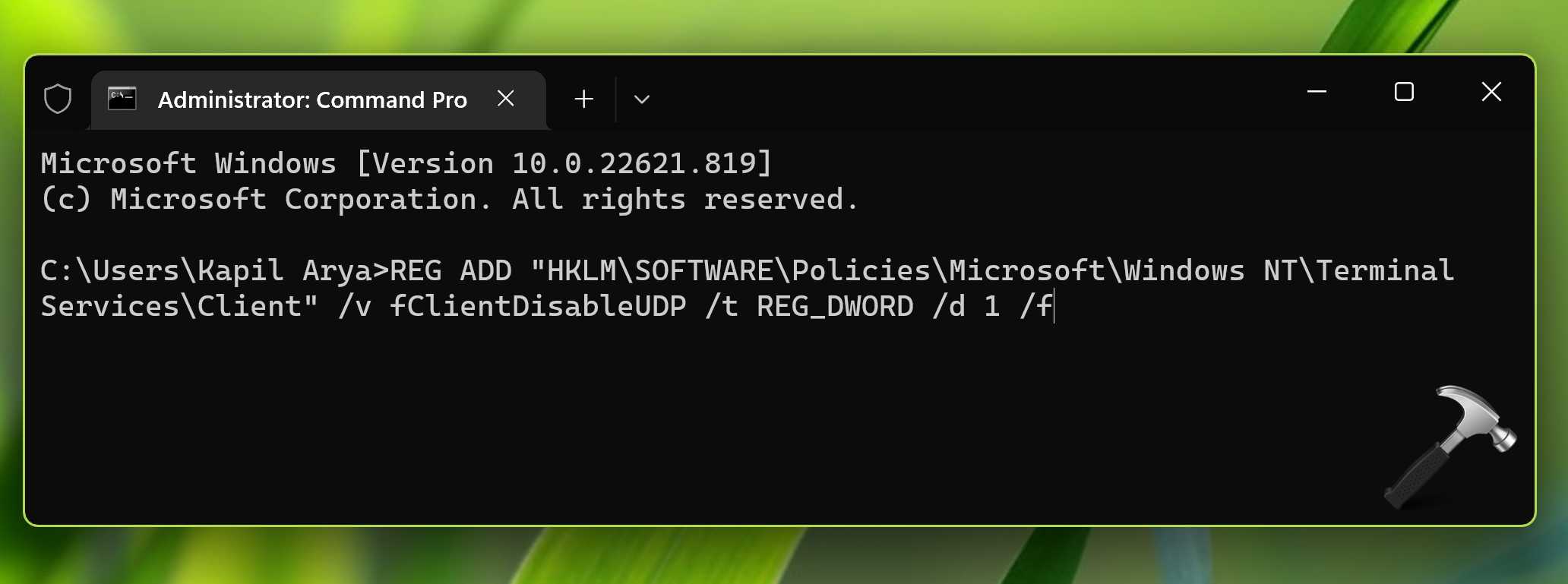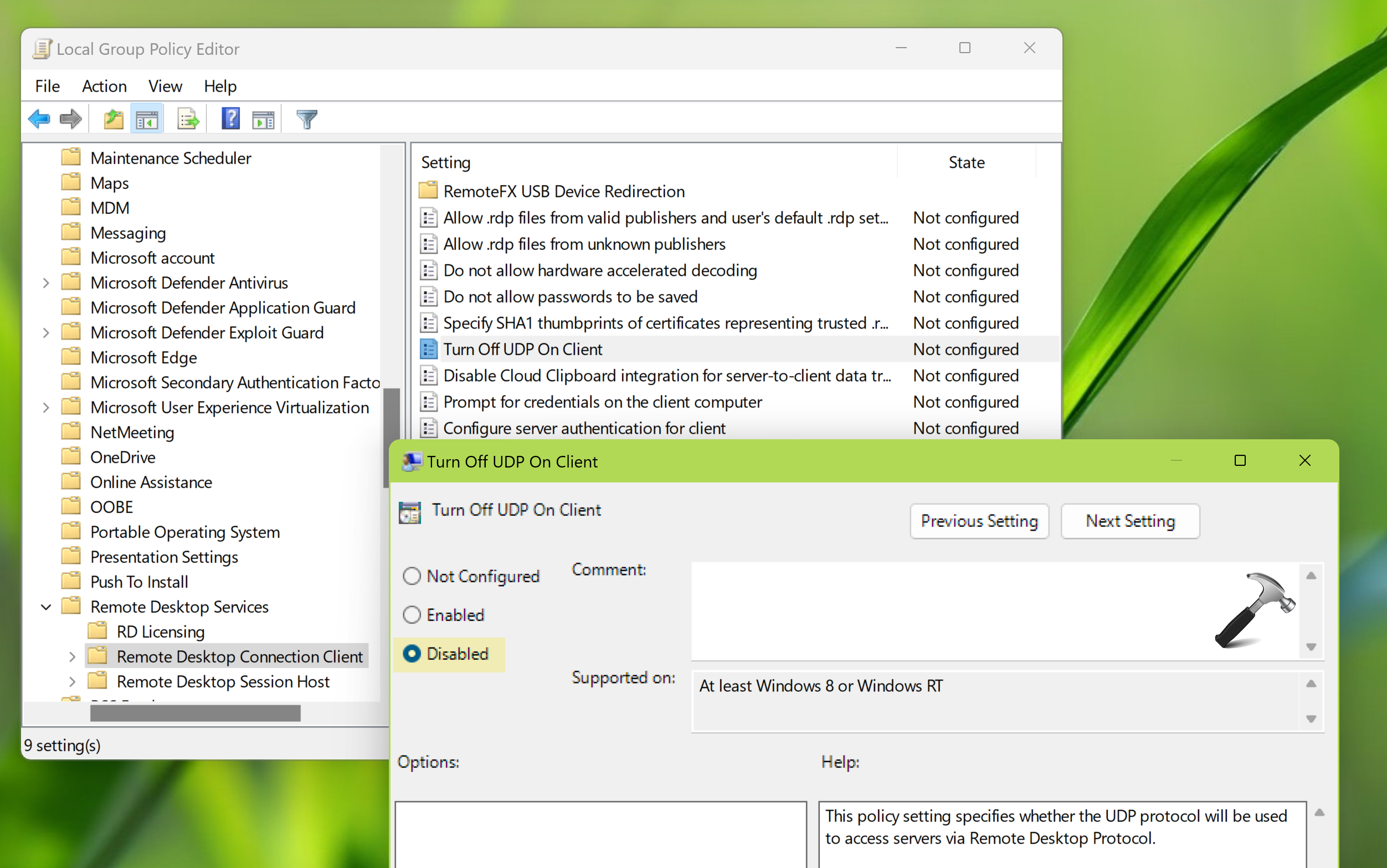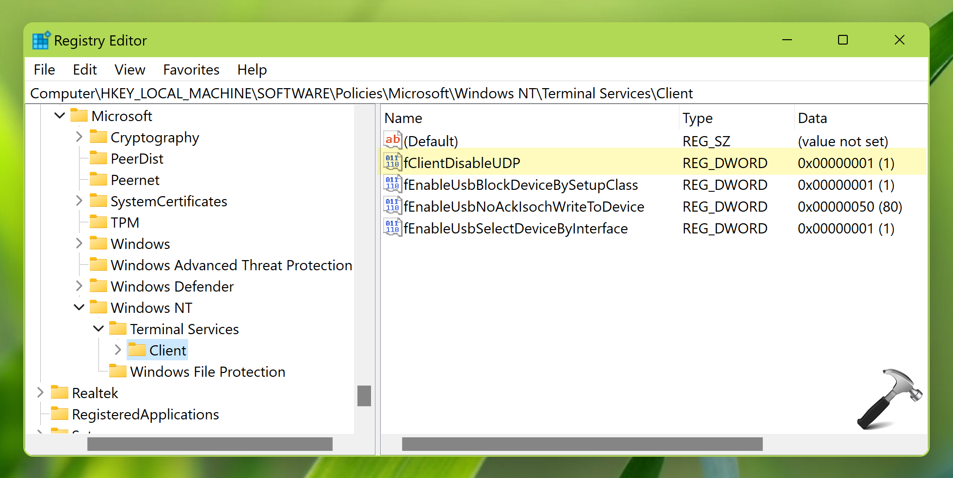 REG ADD "HKLMSOFTWAREPoliciesMicrosoftWindows NTTerminal ServicesClient" /v fClientDisableUDP /t REG_DWORD /d 1 /f
