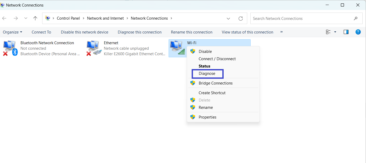2. Kliknij prawym przyciskiem myszy Wi-Fi > wybierz Diagnozuj.