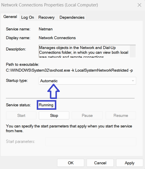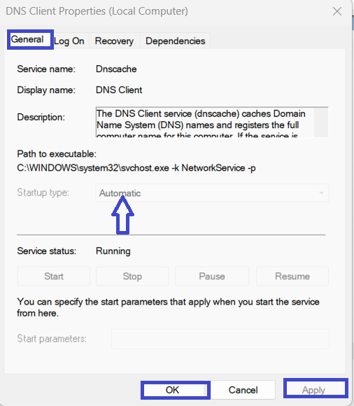 6. Kliknij kartę Ogólne > Ustaw typ uruchamiania na Automatyczny.