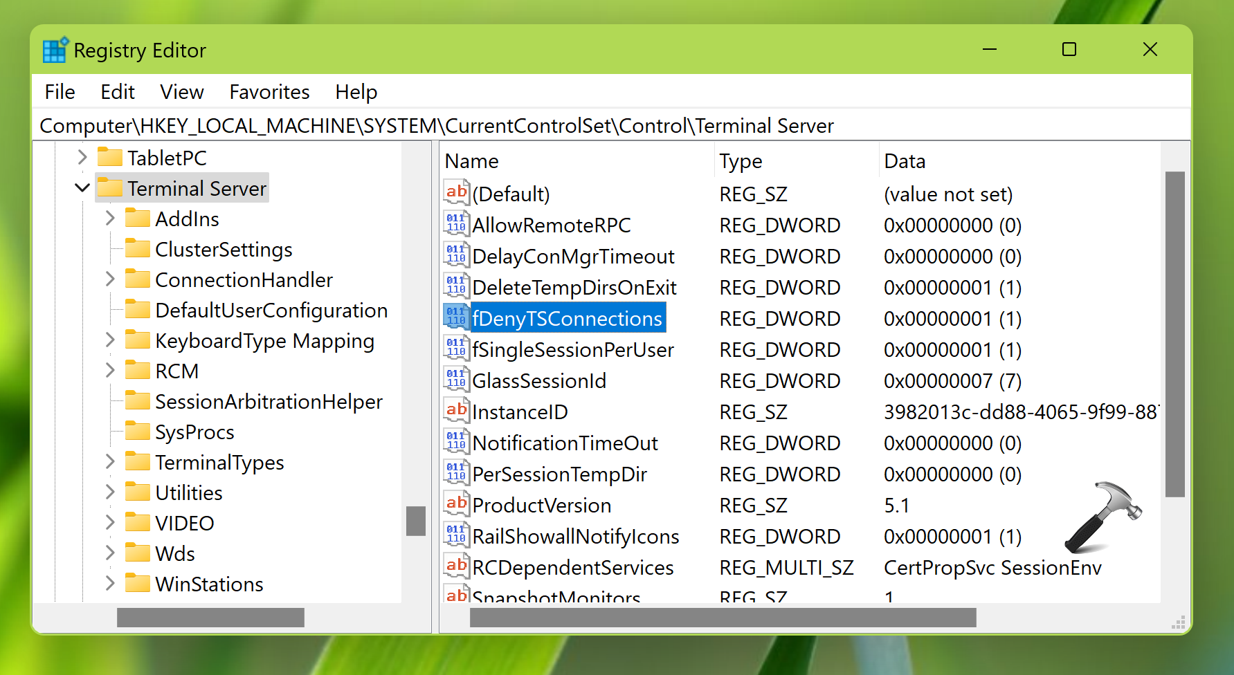HKEY_LOCAL_MACHINESYSTEMCurrentControlSetControlTerminal Server