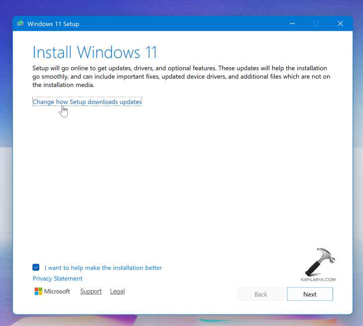 4. Na ekranie konfiguracji systemu Windows 11 kliknij przyciskZmień sposób, w jaki instalator pobiera aktualizacje.