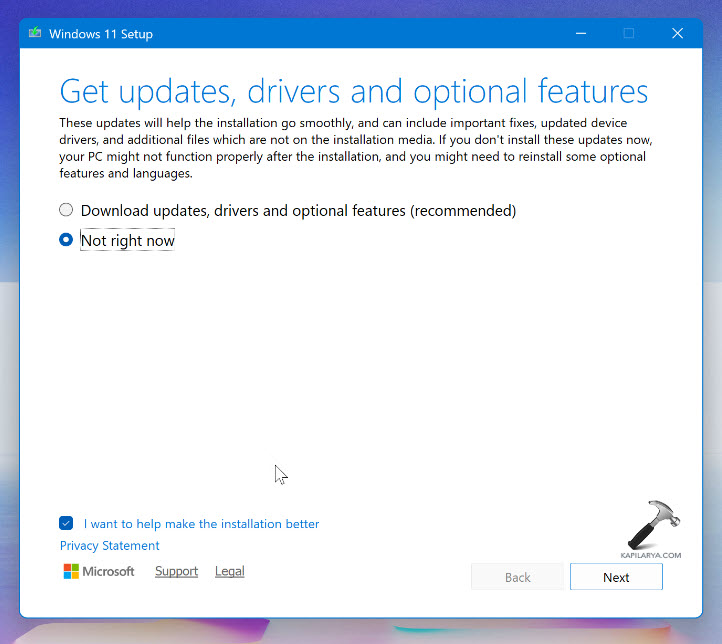 5. Na następnym ekranie wybierzNie teraz. Jeśli chcesz, możesz odznaczyć tę opcjęChcę pomóc w udoskonaleniu instalacji.