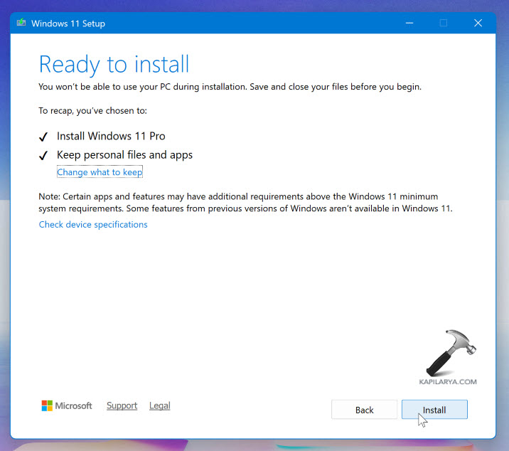 Notatka:W tym oknie musisz potwierdzić, czy przechowujesz osobiste pliki i aplikacje. Ponieważ jest to wyłącznie aktualizacja naprawcza, zdecydowanie zaleca się zachowanie aplikacji i danych z plikami osobistymi. Postępując w ten sposób, żadne dane nie zostaną utracone, a jedynie zostanie naprawiona pliki systemu operacyjnego. Jeśli jednak chcesz również usunąć dane, możesz kliknąć Zmień, co chcesz zachować, a następnie wybrać Nie przechowuj niczego.