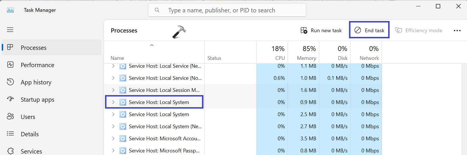 1. Otwórz Menedżera zadań. Znajdź „Host usługi: system lokalny”.