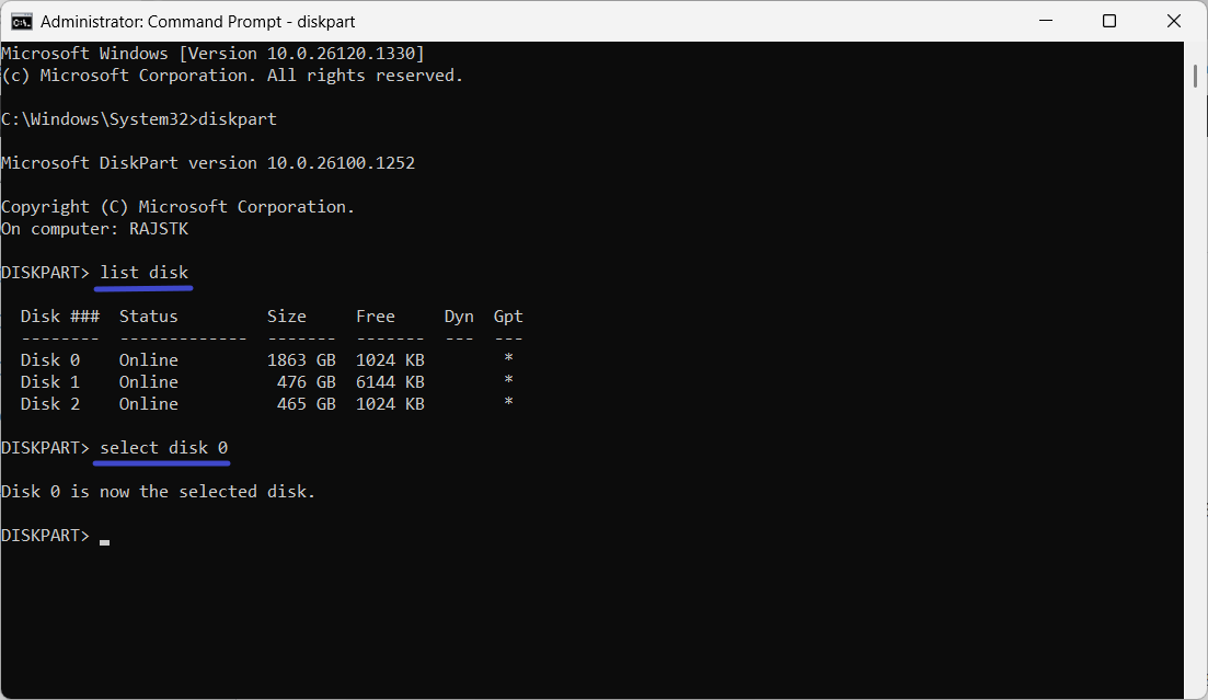 #w kolumnie GPT znajduje się dysk GPT. Jeśli nie ma gwiazdki, jest to dysk MBR.4. Następnie uruchom „wybierz dysk nr”polecenie, aby wybrać dysk główny. Pamiętaj o wymianie