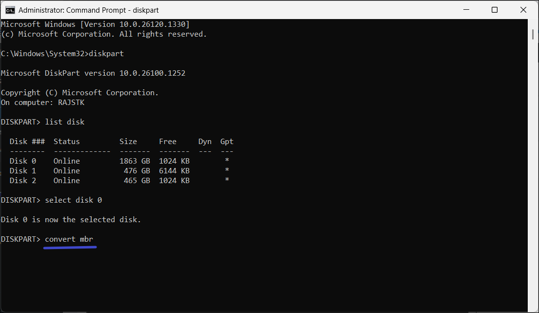 7. Po sprawdzeniu zgodności uruchom to polecenie, aby przekonwertować dysk: