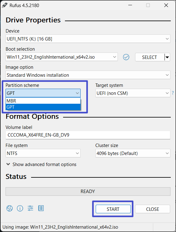 Po utworzeniu nośnika instalacyjnego przy użyciu opcji napędu flash USB narzędzie automatycznie sformatuje dysk USB jako dysk MBR. Umożliwia to instalację systemu Windows na dysku MBR lub GPT, o ile tryb rozruchu jest zgodny.