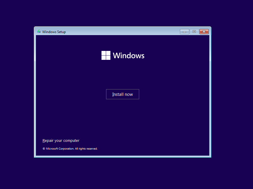 1. Gdy w trakcie instalacji pojawi się błąd, naciśnijShift + F10aby otworzyć Wiersz Poleceń, lub wróć do pierwszego ekranu instalacyjnego (ekran Zainstaluj teraz) i kliknij przycisk „Napraw swój komputer”w prawym dolnym rogu.