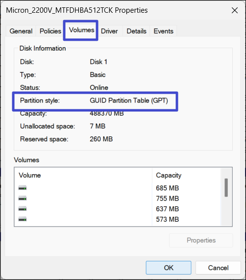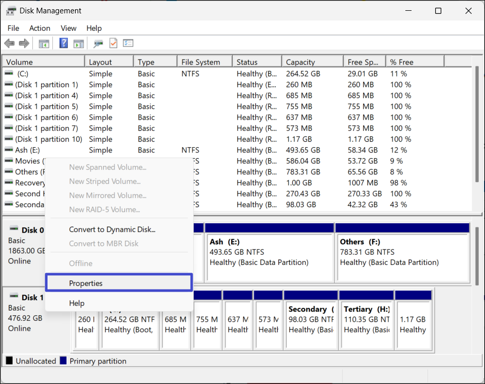 tj. dysk 1“.2. Kliknij prawym przyciskiem myszy dysk, na którym jest zainstalowany system Windows i wybierz „Właściwości„Zanotuj także numer dysku