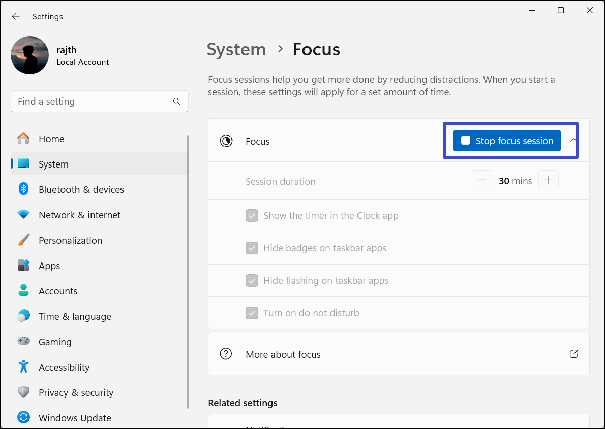 3. Jeśli aktualnie uczestniczysz w sesji fokusowej, kliknij „Zatrzymaj sesję skupienia”, aby to zakończyć.