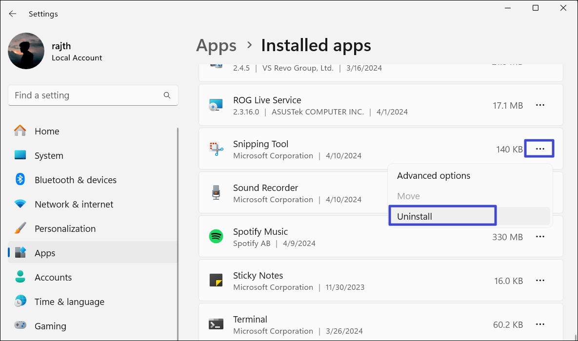 2. Kliknij trzy kropki obok „Narzędzie do wycinania” i wybierz „Odinstaluj“.