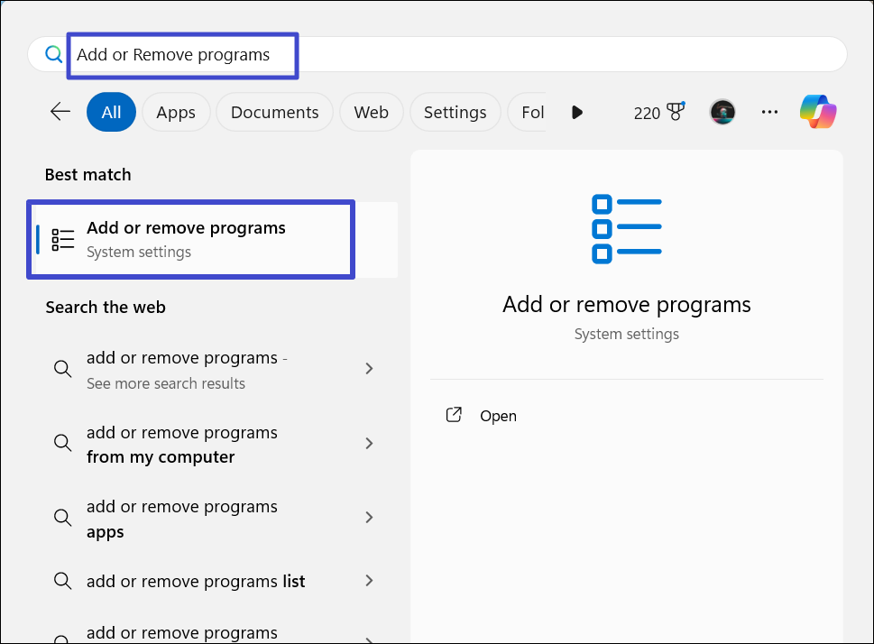 1. W menu Start wyszukaj i wybierz „Dodaj lub usuń programyustawienia.