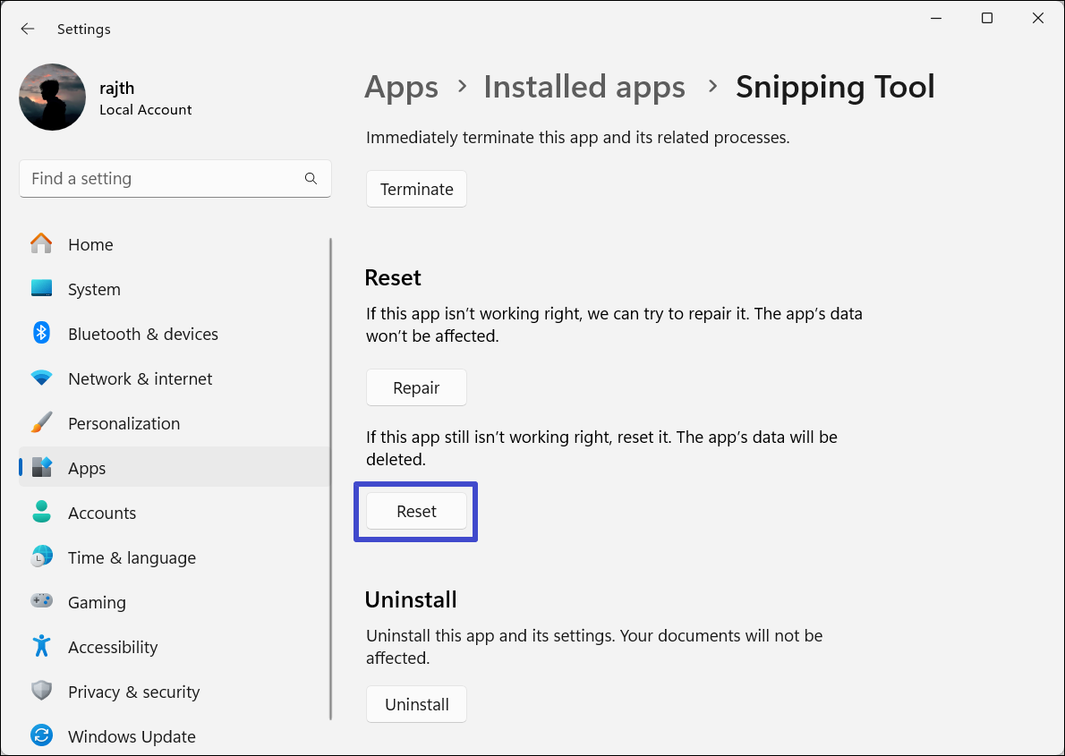 Metoda 10: Zresetuj aplikację narzędzia do wycinania